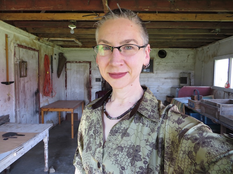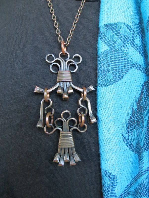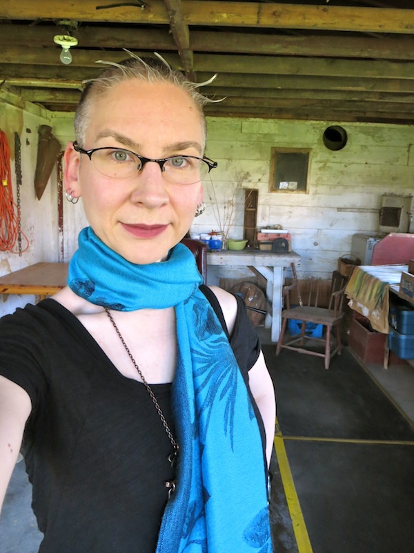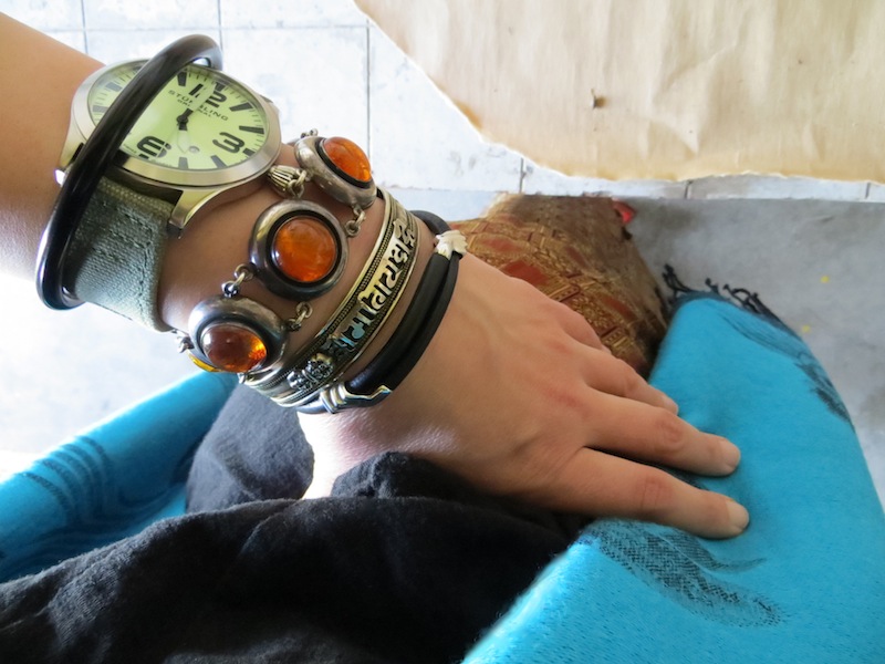 | necklace: random jewelry booth ~20 years ago, worn here usual wrist business: Swiss Army Cavalry watch (beloved gift 1994), silver OM bracelet (Lollapalooza vendor, early '90s), leather and silver "hands" bracelet (AGO, precious gift, early '90s replaced 2005), rubber O-ring silver and amber bracelet: gift to self 2008, Pages (very dear local shop, now closed) |
