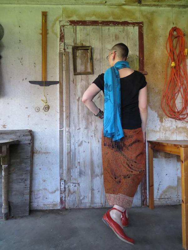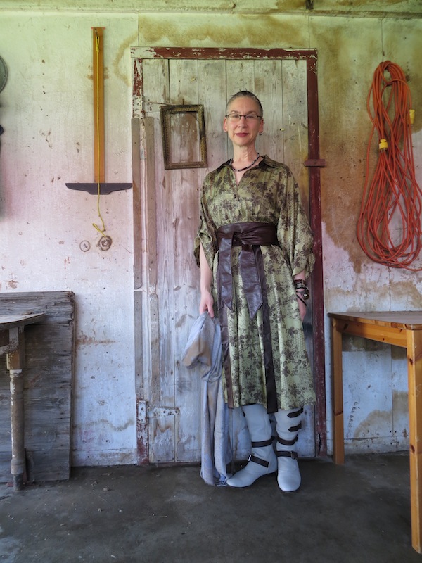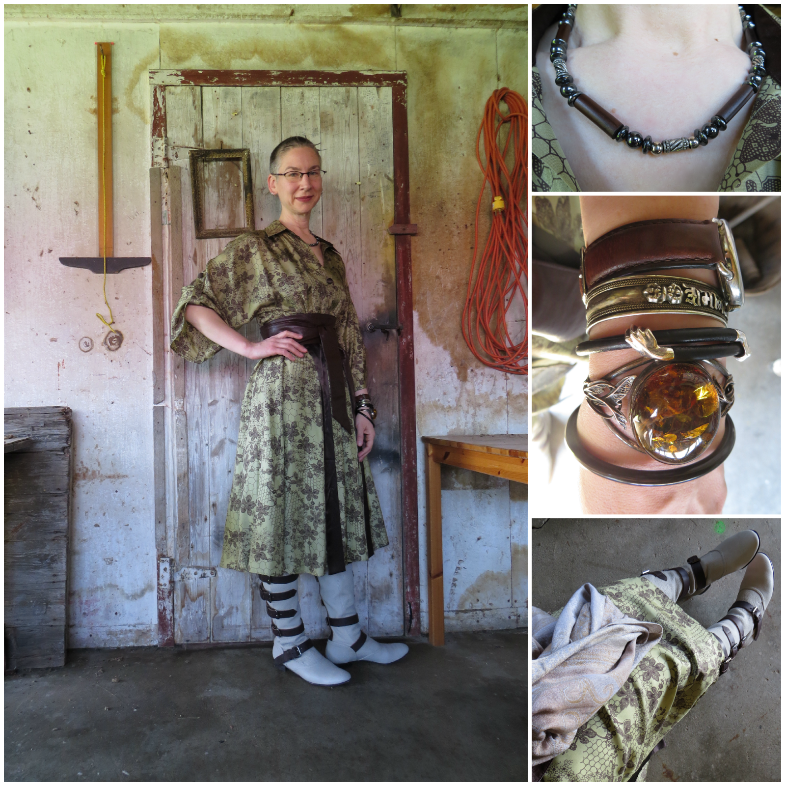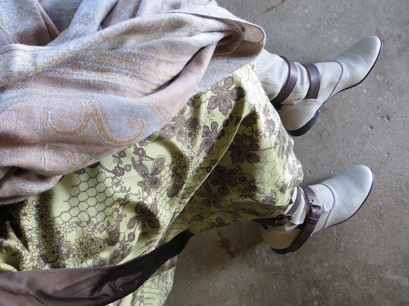 | green silk honeycomb-and-floral dress: Nylon by Dex, Netty Vintage brown wrap belt: no label, Netty Vintage scarf: Charming Charlie, worn here pirate boots: Vivienne Westwood, My Habit, worn here |